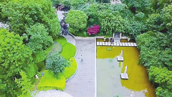 绿植丰富,小游园、浅水池、凉亭相映成趣,居民悠闲地流连其间