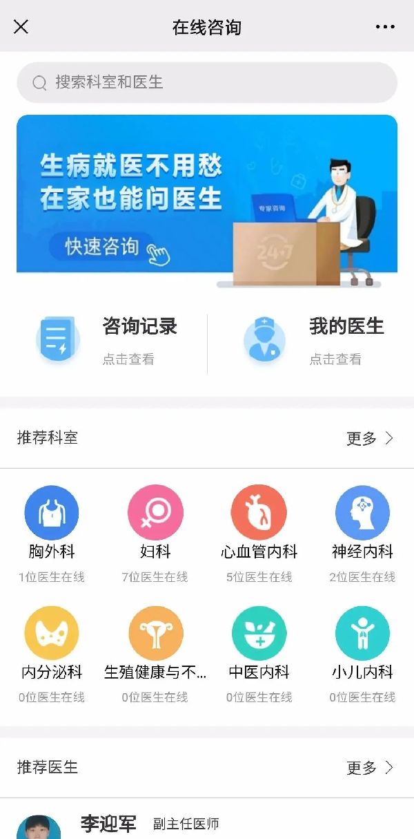 扫描下方二维码进入邢台市第三医院互联网医院线上诊疗咨询页面。选择“推荐科室”或“推荐医生”中的选项,找到所需医生开始咨询。
