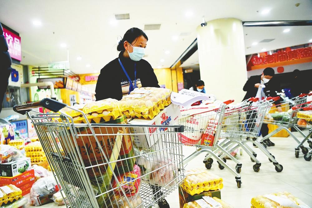 3月6日,家乐园·百货清河店工作人员在有序打包蔬菜、肉、鸡蛋、水果等民生物资。