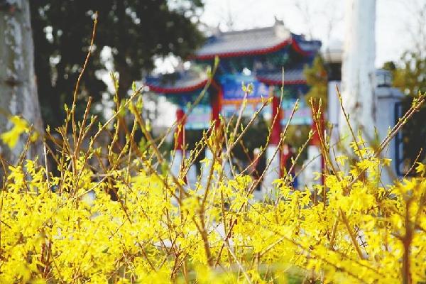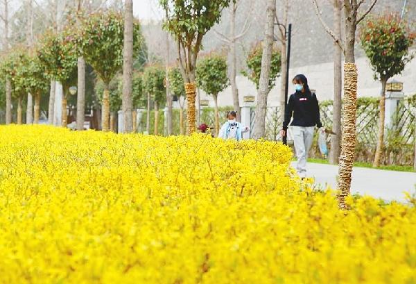 市城管局园林中心工作人员介绍,这里种植着共约900平方米的连翘花,沿游路蜿蜒近百米,如同一条金色“花带”环绕古城墙,十分惹眼。