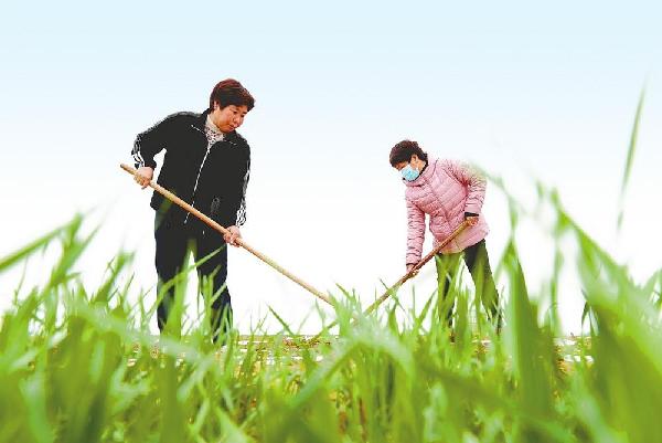 3月20日,任泽区象王庄村民在为冬小麦除草。任泽区农民抢抓农时进行冬小麦除草、施肥作业,为丰产丰收打下良好基础。 (邢台日报社全媒体记者 霍红军 付星雨摄)