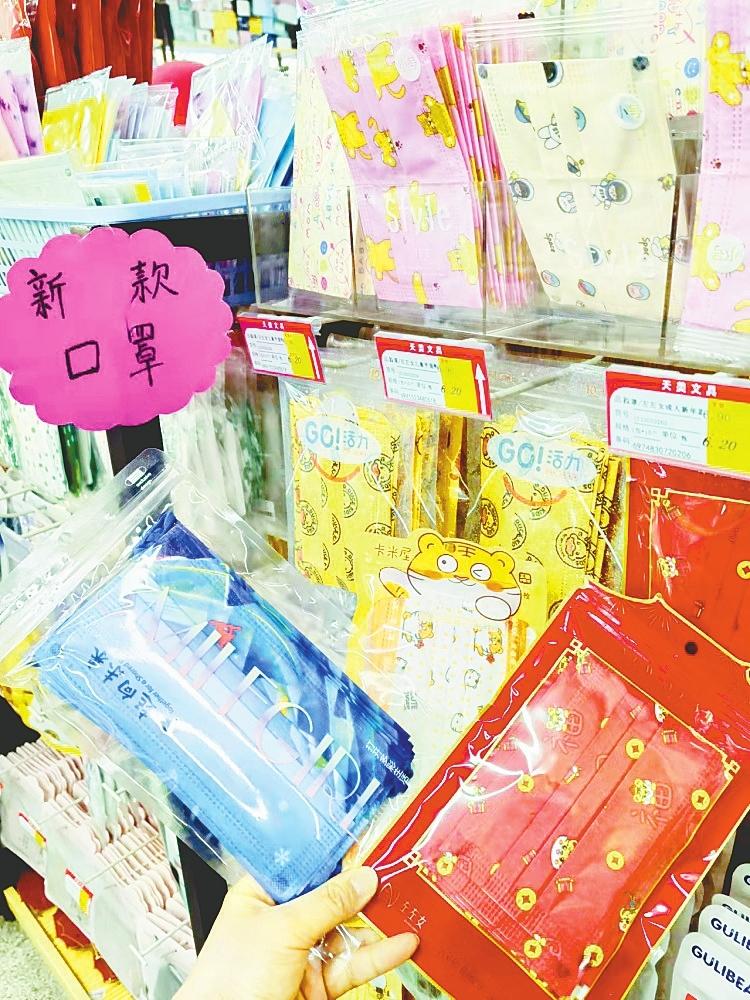 当日,在中华大街一文具商店内,一排排色彩夺目,样式花哨的口罩,被整齐地摆放在最显眼的位置。有的口罩外面印有“吉祥话语”,有的上面画着“卡通人物”,还有的是明星同款无痕“美容口罩”。每包口罩的价位在5元—20元不等。