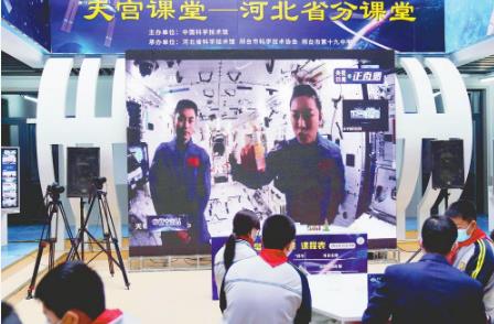3月23日,神舟十三号乘组航天员翟志刚、王亚平、叶光富在中国空间站相互配合,给地面观众上了场“宇宙级”的网课。本市第十九中学是全省唯一“科普大篷车”分会场,该校师生与“太空教师”同步操作了实验。(邢台日报社全媒体记者 田晓丽 摄)