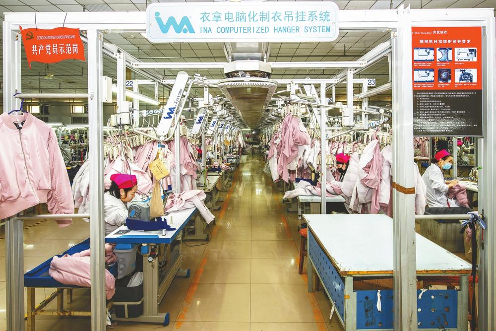 连日来,位于宁晋县的河北奔发制衣有限公司生产车间内,工人们赶制服装订单。