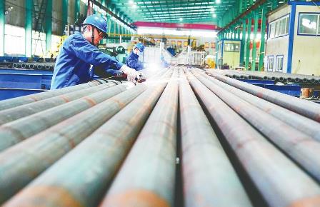大图:在任泽区河北永明地质工程机械有限公司钻杆车间内,工人正在对钻杆外观进行修整。