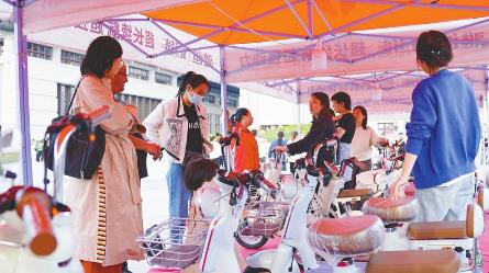 10月4日,市民在博物馆广场邢台市第12届惠民电动车团购会上选购电动车并了解电动车以旧换新政策。本次活动由市商务局、邢台日报社主办,现场汇聚了目前市场上优质的电动自行车品牌供消费者选择。