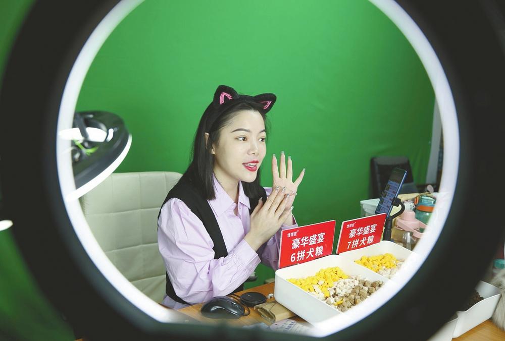 位于南和区河郭镇的一家宠物食品企业,主播在通过网络直播销售产品。武国栋摄