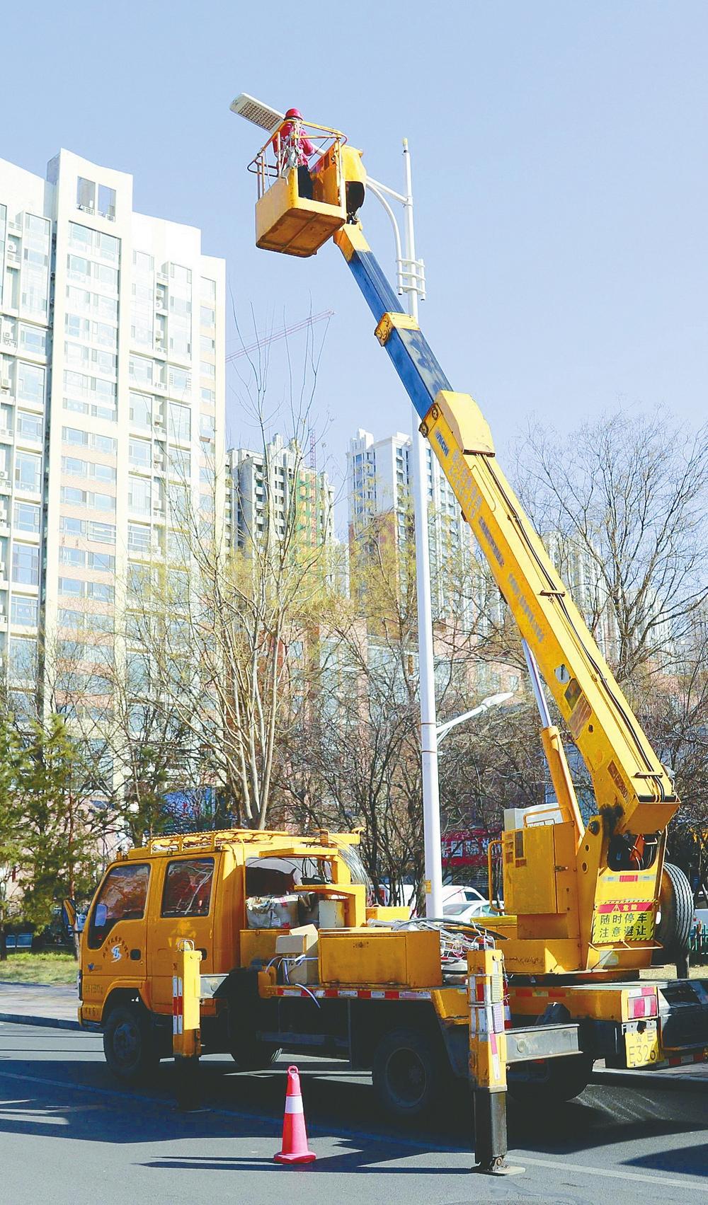 2月18日,在冶金北路与莲池大街交叉口附近,市城管局市政维护工人正在维修灯具故障的路灯。 黄涛、霍少岩摄