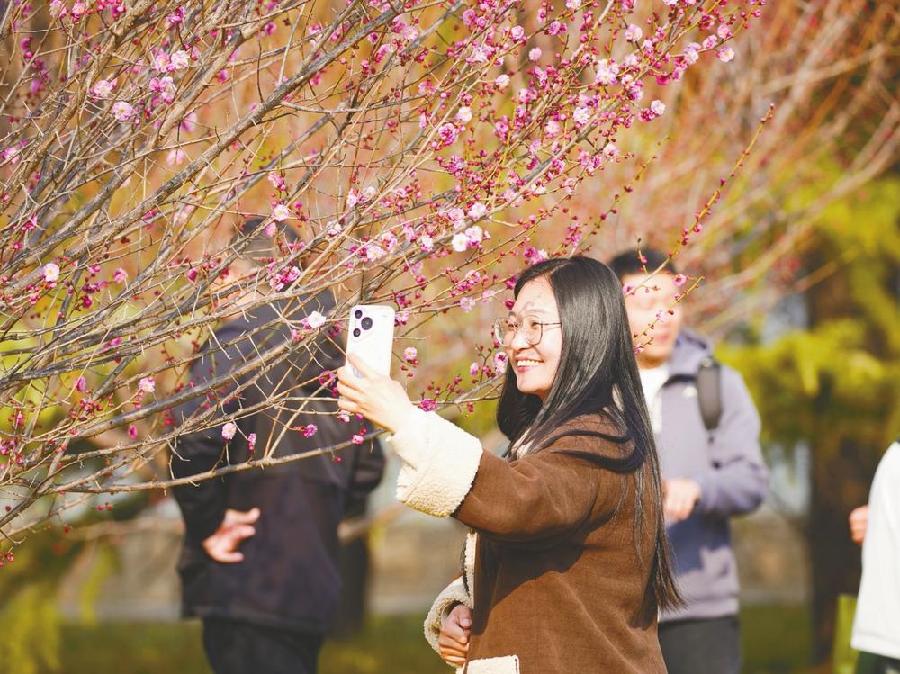 3月9日,达活泉公园里的梅花竞相绽放,吸引众多市民前来赏梅、拍照。