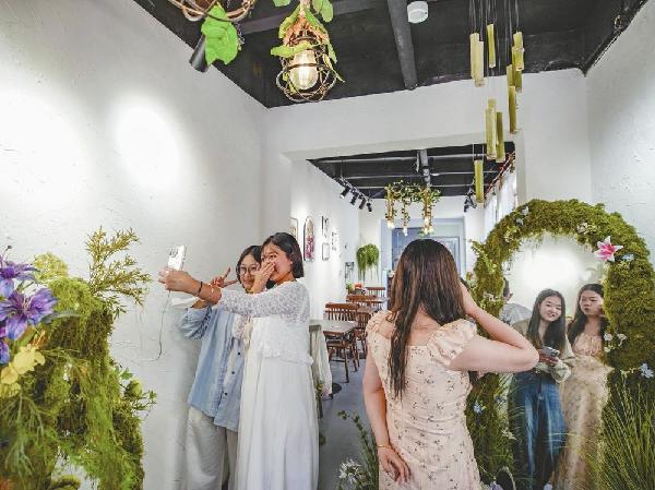 日前,游客在好南关花市街一家店铺打卡拍照。本报记者 韩文洲摄