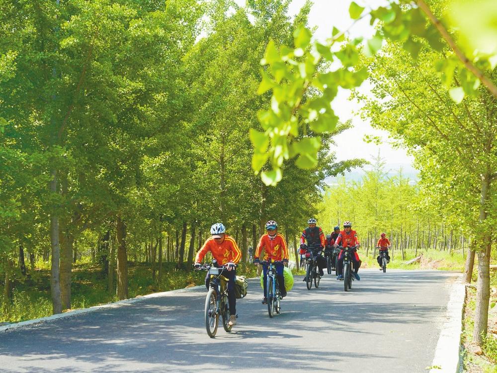 图为骑行爱好者在沙河市栾卸风景区银杏林自行车赛道骑行。(资料图片) 本报记者 韩文洲摄