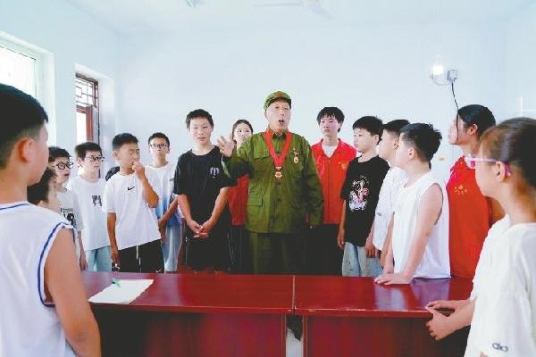 7月30日,在临城县东镇镇南孟村的暑期公益课堂,老兵刘爱国为孩子们讲述当年在战争中冲锋陷阵的故事。韩文洲、徐少立摄