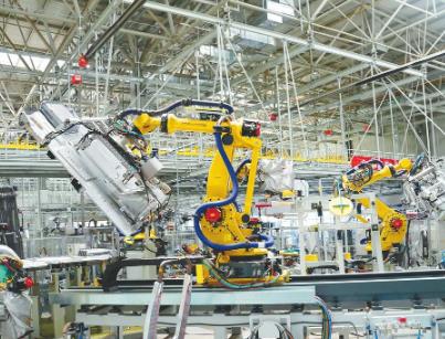 河北长征汽车制造有限公司焊装车间内,机械臂正在焊接新能源重卡零部件。韩文洲摄