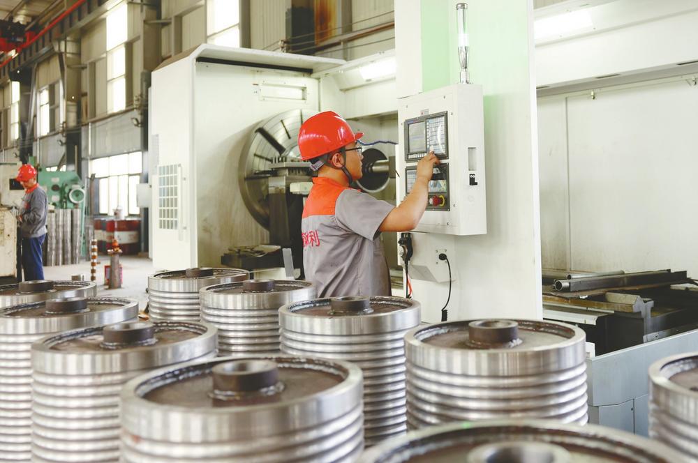 近日,在新河县黄河水利机械有限公司加工车间,工人在操作数控机床。 水利机械制造是新河县的传统产业之一。近年来,新河县大力实施创新驱动发展战略,通过建强产业园区、落实惠企政策、强化产业链招商等举措,鼓励和引导企业加大技术改造投入,优化产品结构,推动水利机械产业提质增效、集群发展。 本报记者 黄涛通讯员李世强摄