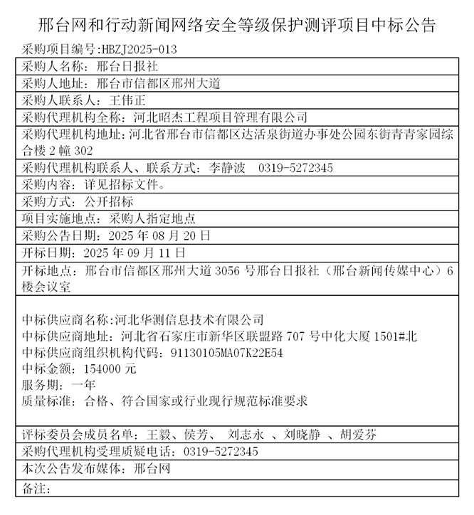 邢台网和行动新闻网络安全等级保护测评项目中标公告