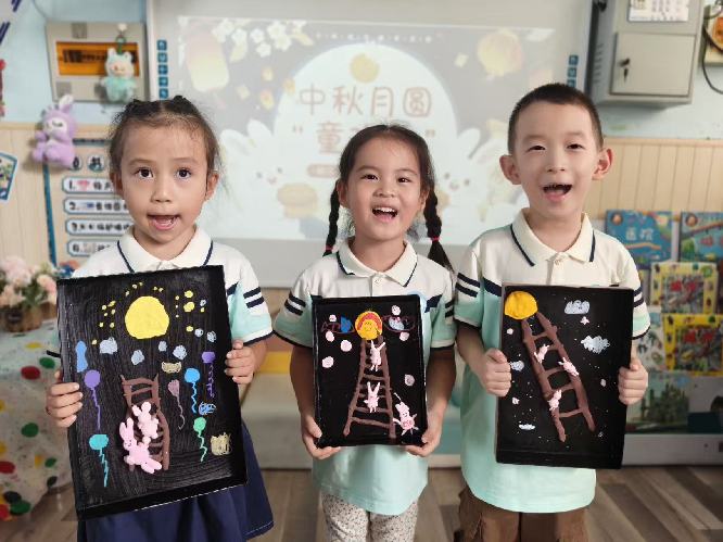 中秋的月光,照进童真的眼;童真的手,捧出团圆的心。小朋友齐动手,把一轮圆月“装”进作品,也把一份文化“收”进童年。圆圆的月亮,长长的天梯,活泼可爱的小兔子,寄托着我们思念!愿大家年年团圆,快乐每一天。