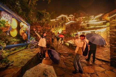 10月9日晚,信都区英谈古寨灯火璀璨,游客漫步古巷,感受古村落韵味,沉醉于夜游的惬意时光。