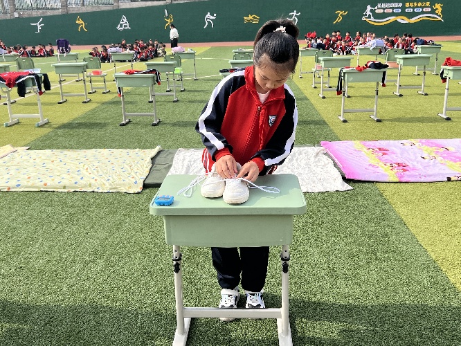 本次大赛设置六个实操项目。赛场上,小选手们精神饱满,穿系鞋带熟练利落,牢固美观;叠被子棱角分明,平整方正;叠衣服动作娴熟,手法标准;系红领巾规范标准,步骤清晰;洗袜子步骤完整,清洁彻底;整理文具分类有序,收纳规范。大家动作娴熟、专注认真,充分展现了学生扎实的自理技能与积极向上的劳动风貌。