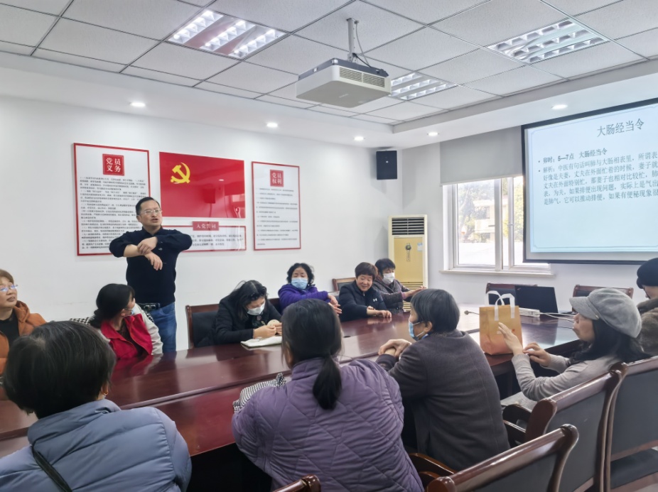 活动伊始,社区特邀顾问带来“中医时辰养生”分享,细致解读人体经络与十二时辰的对应规律,着重强调顺时作息对养护的重要性;同时现场教学简易穴位按摩法,讲解中脘穴健脾和胃促消化的功效,以理论结合实操的方式,让居民轻松掌握实用保健技巧。