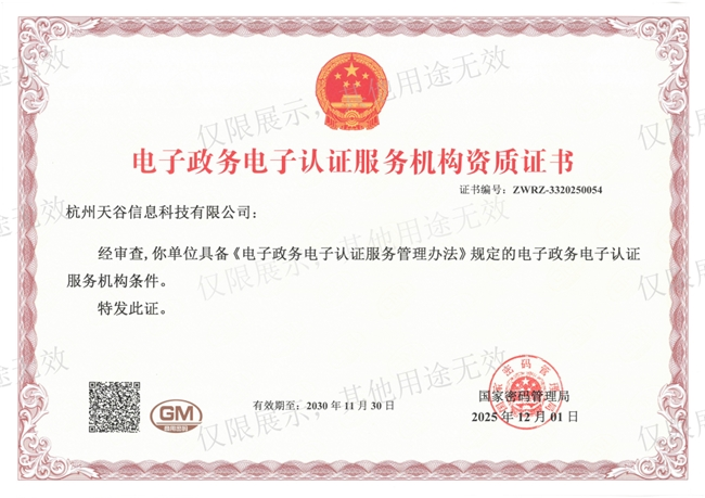 近日,e签宝(天谷CA)通过国家密码管理局的资质审查,获颁《电子政务电子认证服务机构资质证书》(政务CA证书)。